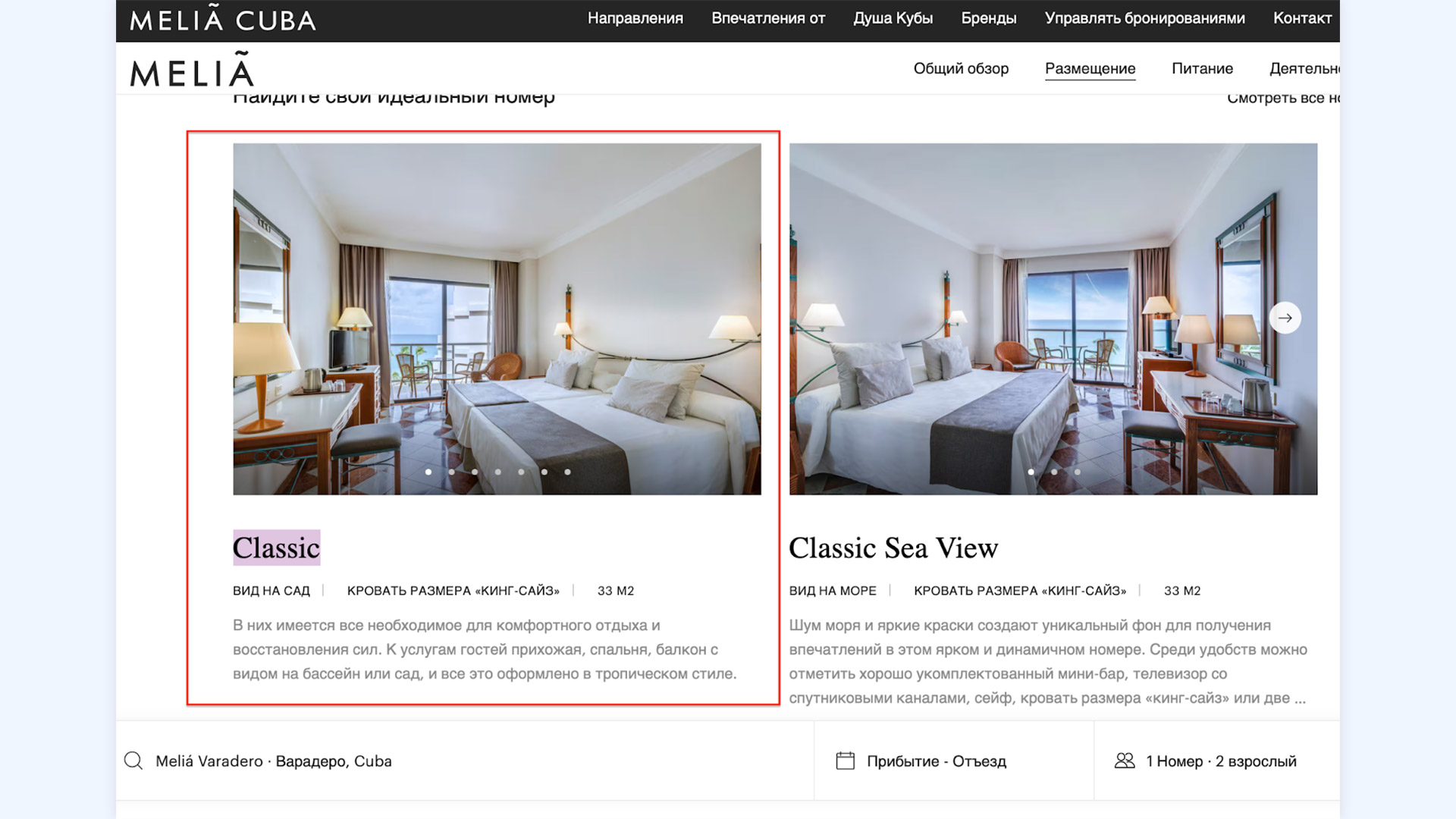 Я вновь пересмотрела отзывы и решила отдать предпочтение пятизвёздочному отелю Meliá Varadero и категории номера Classic с видом на сад. Подчеркну, я знала, что на Кубе есть определённые проблемы в сфере гостиничного бизнеса, поэтому не рассчитывала на роскошный отдых. Но мне казалось, что классификация «пять звёзд» гарантирует приемлемые условия.