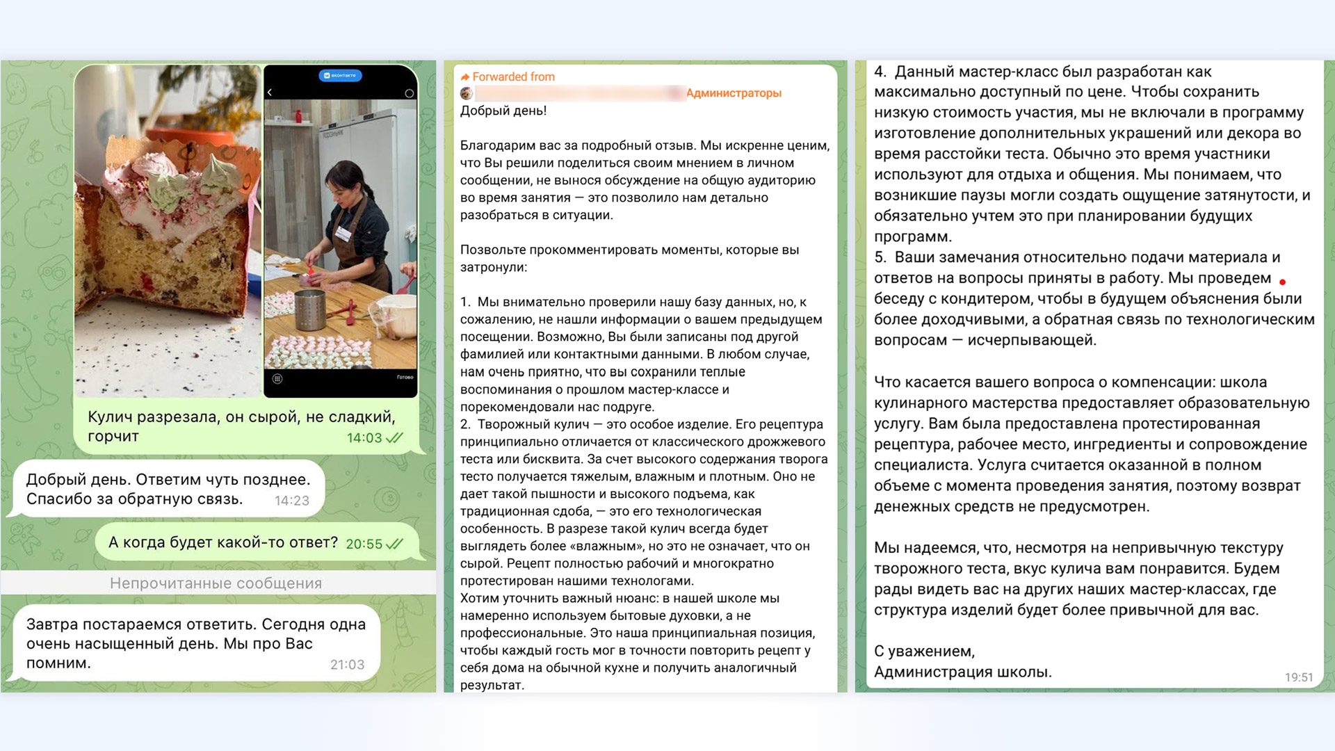 Я даже спросила у ведущей, что пошло не так, но внятного ответа не получила. Она сказала, что забыла включить духовку или что там были проблемы с конвекцией. На мой взгляд, это недопустимо. А самое странное, что на следующее утро моя подруга связалась со школой, и ей в возврате отказали, хотя аргументы у неё были такими же, как у меня».