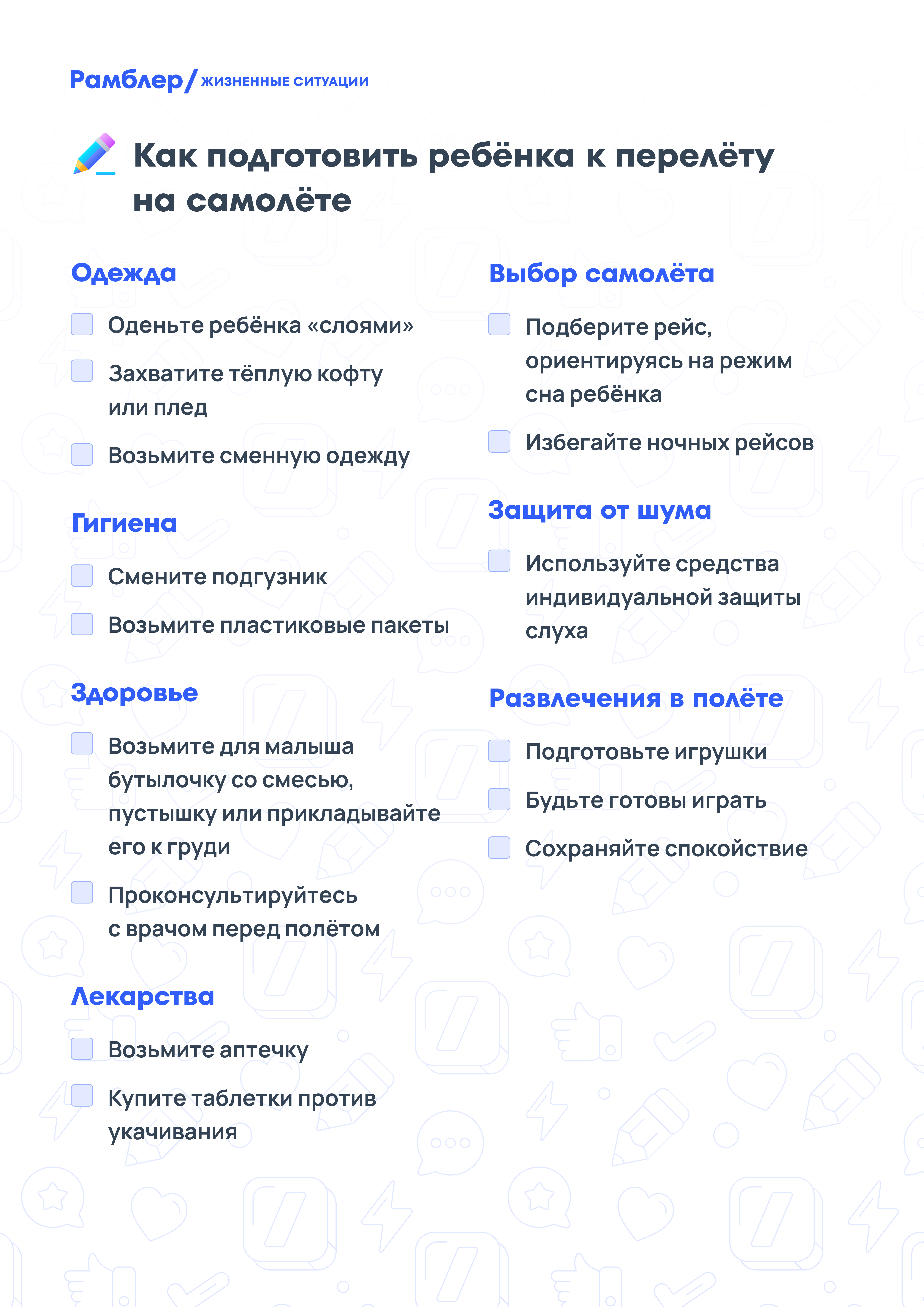 В 2024 году Сочи, Москва и Санкт-Петербург стали самыми популярными городами, куда россияне летали с детьми. Чтобы авиапутешествие с ребёнком прошло лёгко и спокойно, к нему нужно правильно подготовиться. Вместе с врачом-педиатром составили чек-лист, который поможет родителям ничего не забыть и подготовить к полёту ребёнка до трёх лет.