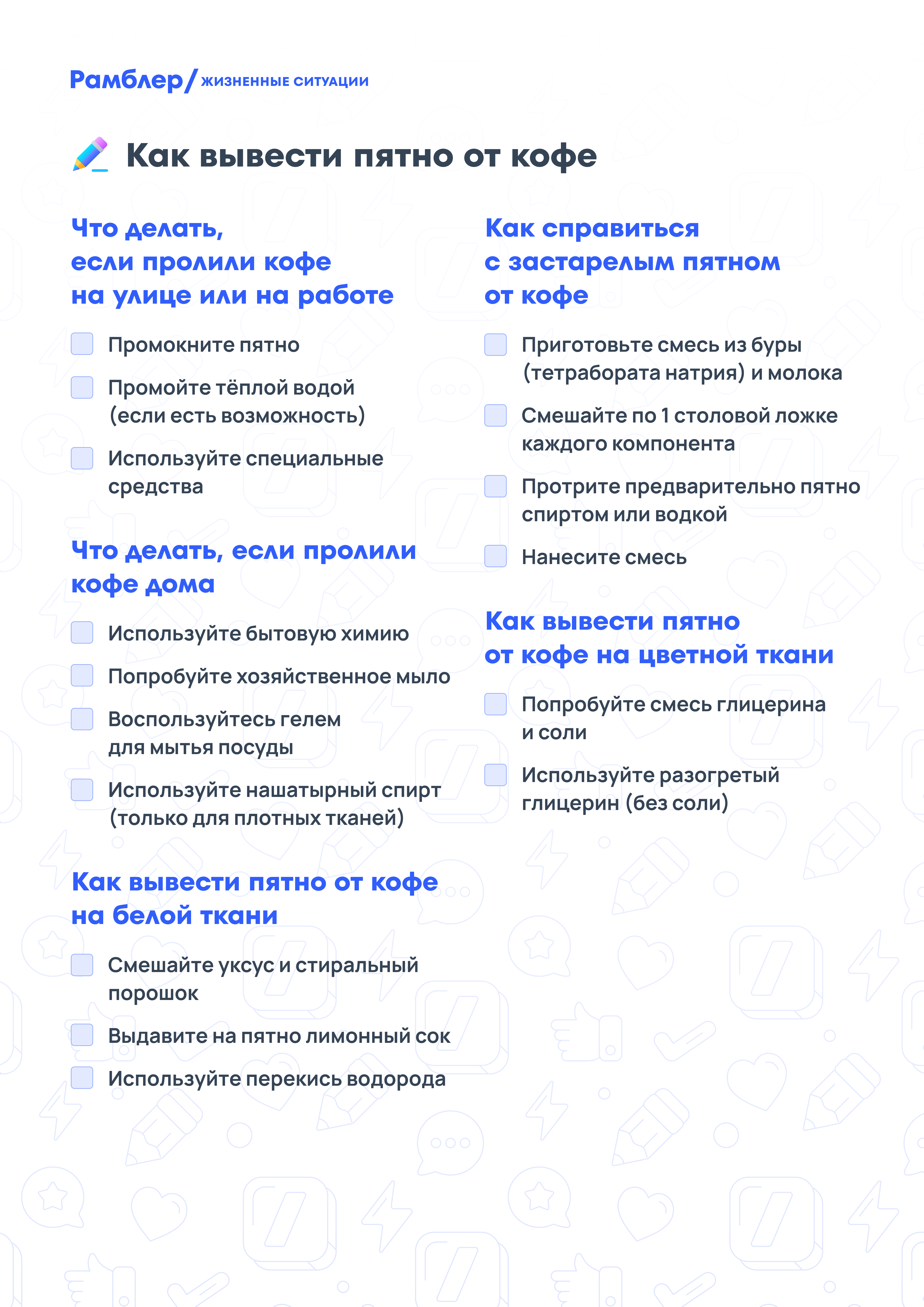 Каждый третий россиянин не представляет рабочее утро без чашки кофе. Но иногда любимый напиток становится причиной пятен на одежде. Вместе с экспертом подготовили гайд, который поможет быстро и эффективно справиться с неприятностью и вернуть ткани безупречный вид.