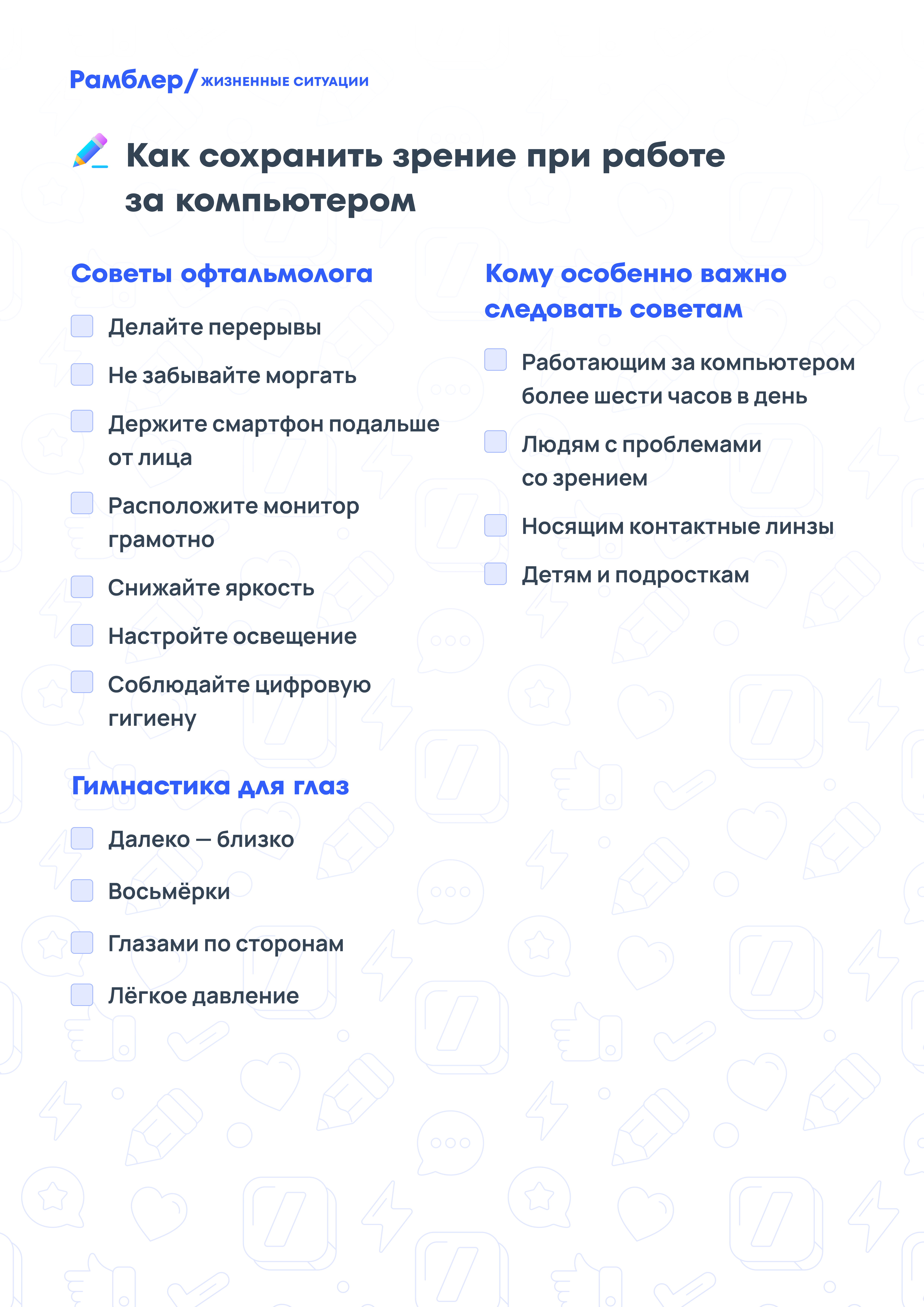 Работа за компьютером негативно влияет на здоровье глаз: появляются сухость, покраснение и раздражение. Мы поговорили с экспертом и составили памятку о том, как сохранить зрение.