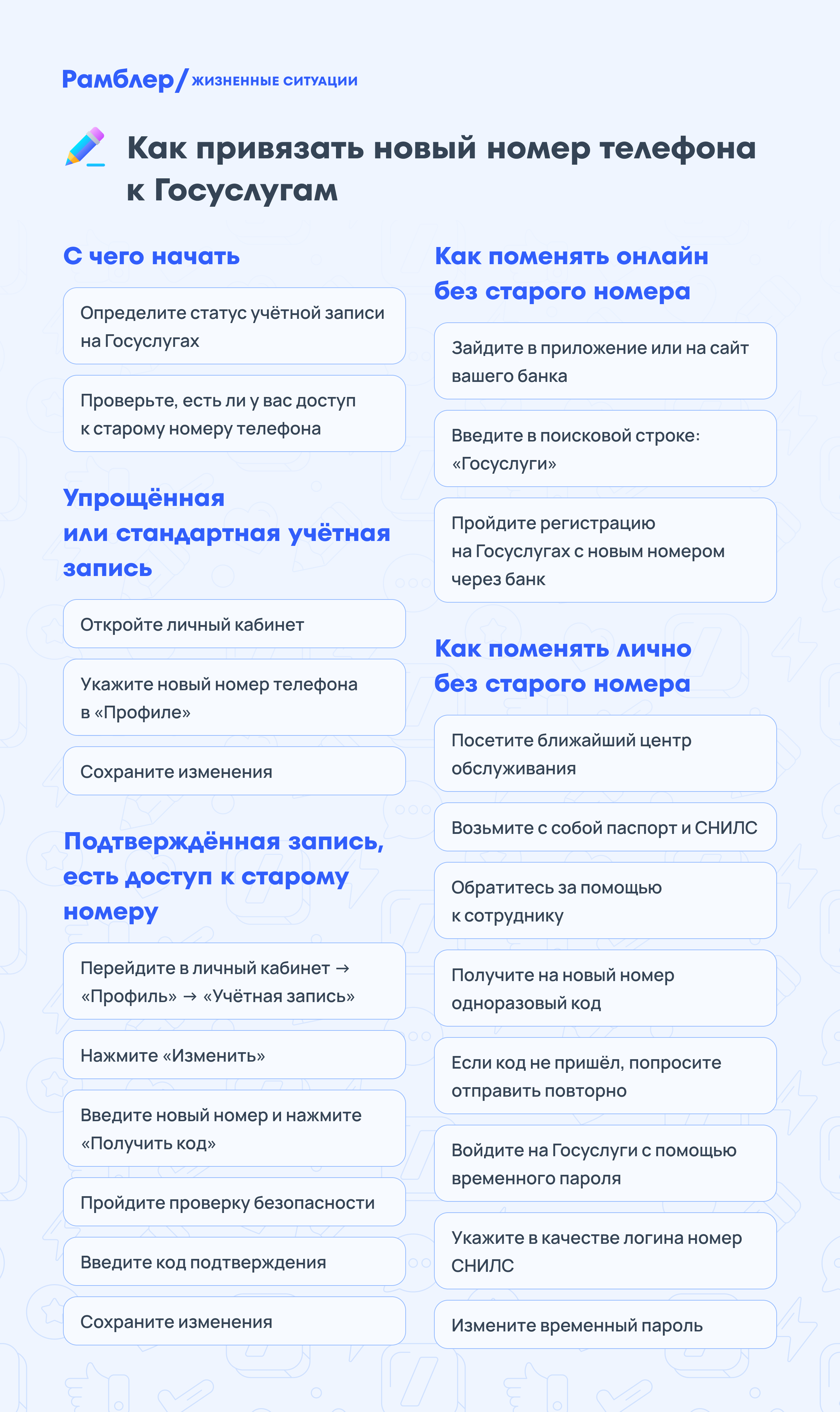 Самый популярный способ подтверждения авторизации на портале «Госуслуги» — СМС-код, который приходит на номер телефона. Но что делать, если номер сменился или вы потеряли к нему доступ? Подготовили инструкцию с актуальными рекомендациями, как привязать к своему аккаунту новый номер телефона.