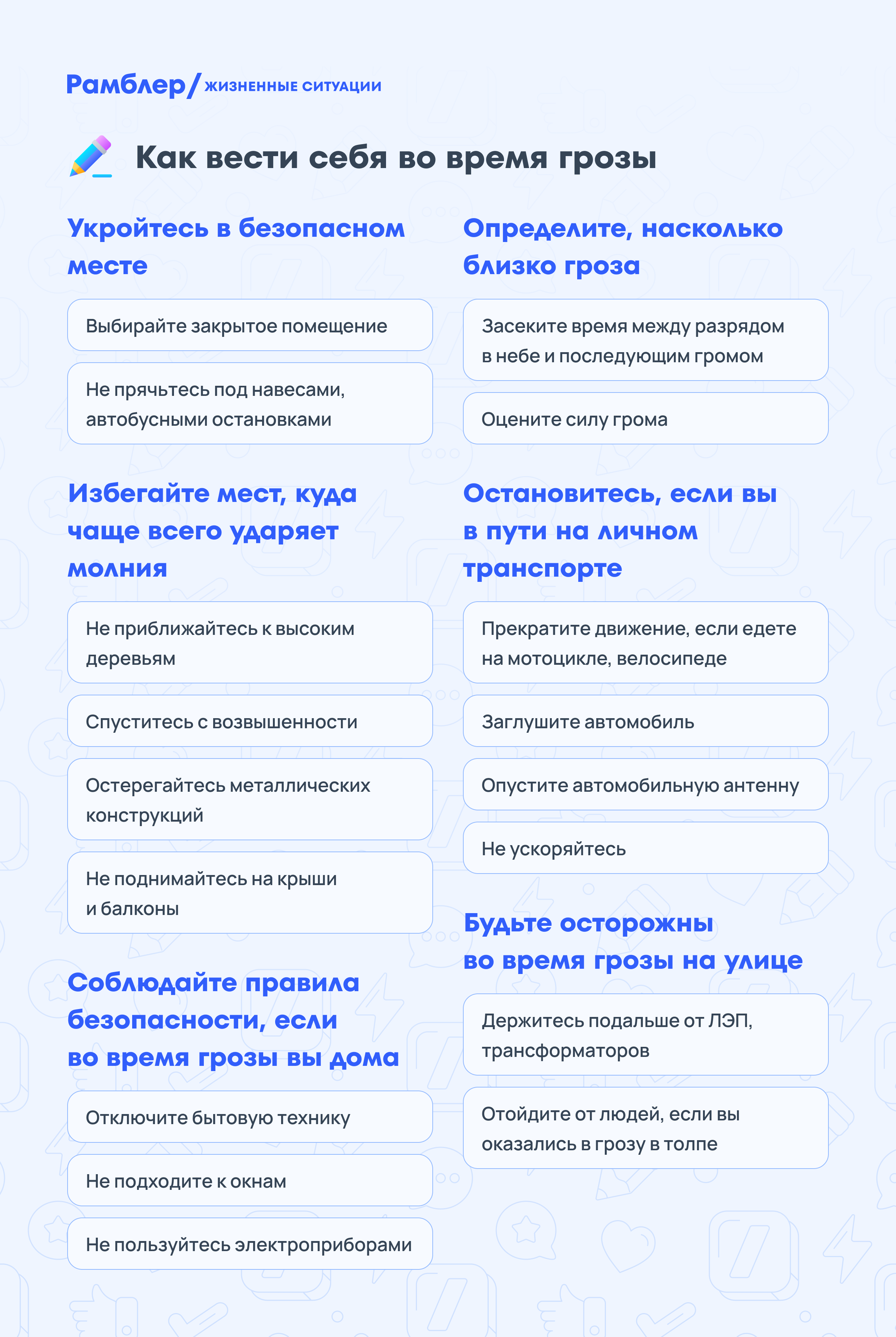 По данным ВЦИОМа, каждый десятый россиянин боится грома и молний. Чтобы избежать удара молнии, важно знать и соблюдать определённые правила безопасности. Подготовили инструкцию, как вести себя, если гроза застала вас дома, на улице или в машине, и чего делать нельзя.