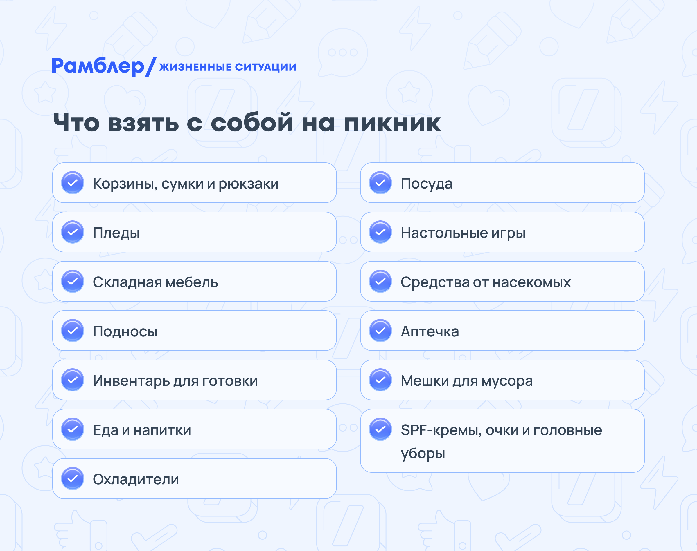 Около 30% россиян ходят на пикники несколько раз в месяц. Среди наиболее популярных локаций — лес, дача и берег реки. Мы поговорили с экспертом и выяснили, какие вещи стоит взять с собой на природу.